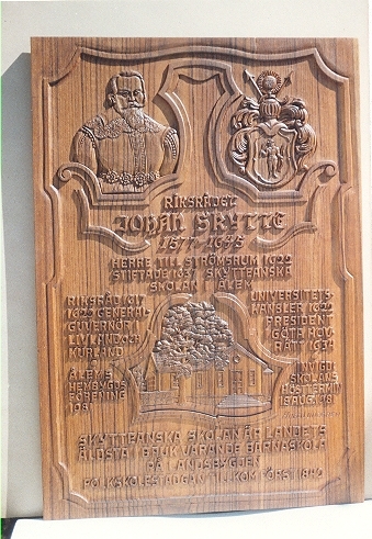 Relief skuren av Hugo Lundgren 1981. Minnestavla över riksrådet med mera Johan Skytte.