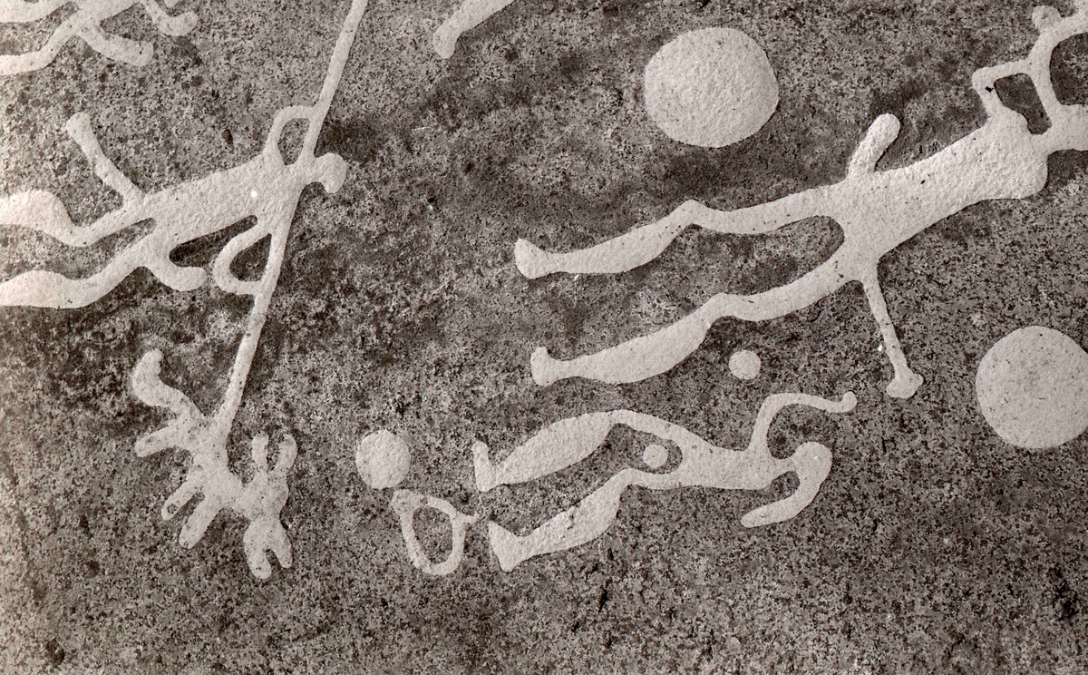 Titel: Hällristningar. Hällristningsområdet i Tanum är ett område i Tanums kommun i Bohuslän där man funnit flera berghällar med stora mängder hällristningar från bronsåldern. Runt den största av dem, Vitlyckehällen, är Vitlycke museum uppbyggt. Hällen har närmare 300 inhuggna figurer och ca 170 skålgropar. Den kanske mest berömda scenen bland alla Tanums hällristningar, "Brudparet", finns här. Bland de övriga närliggande hällarna märks Litsleby med en ca 2,3 meter lång spjutbeväpnad man, "Spjutguden", och Aspeberget med en plöjningsscen, ett antal oxar och skepp. Hällen vid Fossum ligger en bit från de övriga. Den kännetecknas av en mer sammanhållen och konstnärlig komposition. Kanske är den gjord av en enda ristare. Hällristningarna har i modern tid fyllts i med röd färg för att göra dem tydligare. Det är inte känt om de var målade från början. (Hämtat från Wikipedia)