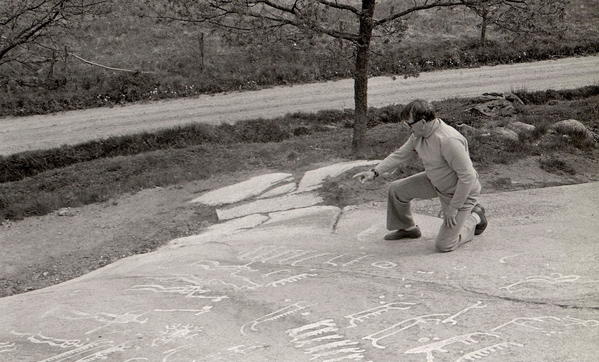 Titel: En man som studerar hällristningar. Hällristningsområdet i Tanum är ett område i Tanums kommun i Bohuslän där man funnit flera berghällar med stora mängder hällristningar från bronsåldern. Runt den största av dem, Vitlyckehällen, är Vitlycke museum uppbyggt. Hällen har närmare 300 inhuggna figurer och ca 170 skålgropar. Den kanske mest berömda scenen bland alla Tanums hällristningar, "Brudparet", finns här. Bland de övriga närliggande hällarna märks Litsleby med en ca 2,3 meter lång spjutbeväpnad man, "Spjutguden", och Aspeberget med en plöjningsscen, ett antal oxar och skepp. Hällen vid Fossum ligger en bit från de övriga. Den kännetecknas av en mer sammanhållen och konstnärlig komposition. Kanske är den gjord av en enda ristare. Hällristningarna har i modern tid fyllts i med röd färg för att göra dem tydligare. Det är inte känt om de var målade från början. (Hämtat från Wikipedia)