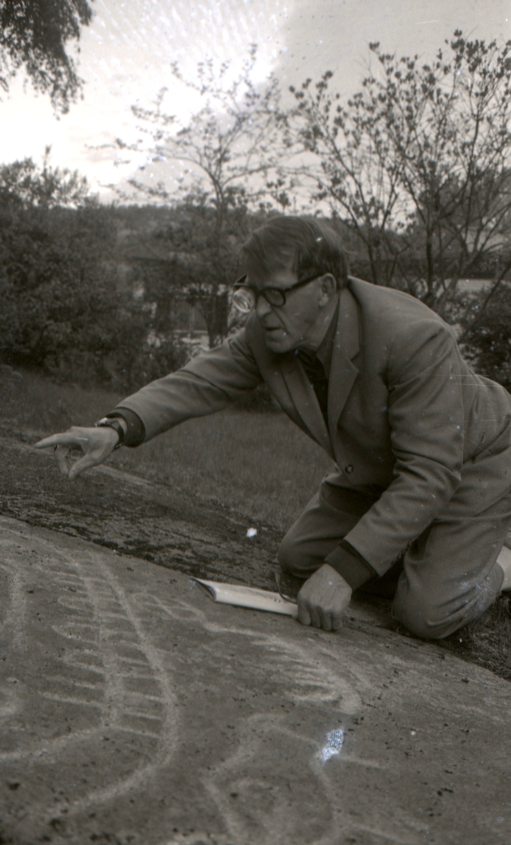 Bild från Hovåsristningen. Allan Bernving studerar hällristningar.