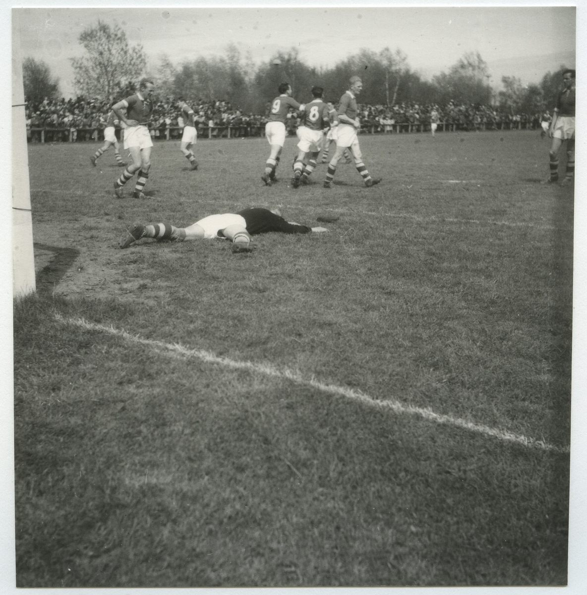 Kalmar Läns Tidning 1946. En synbarligen besviken målvakt under en match mellan AIK och Kalmar FF