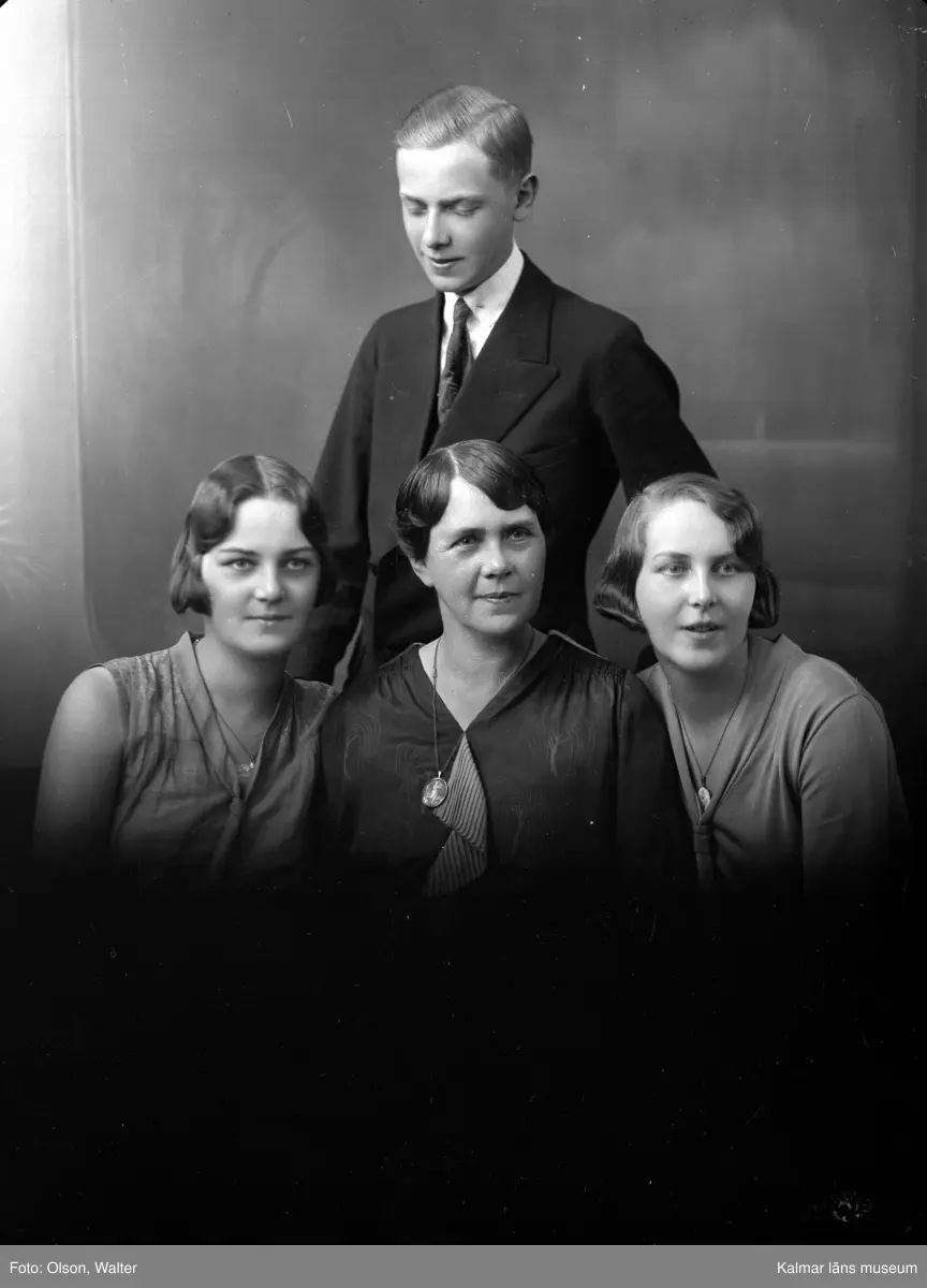 Porträtt av en familj. Enligt Walter Olsons journal är bilden beställd av fru J Engström. Kalmar läns museum känner inte till om den personen är avbildad.
