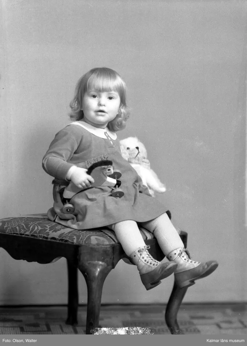 Ateljéfoto. Liten flicka med leksaker, sittande på taburett.