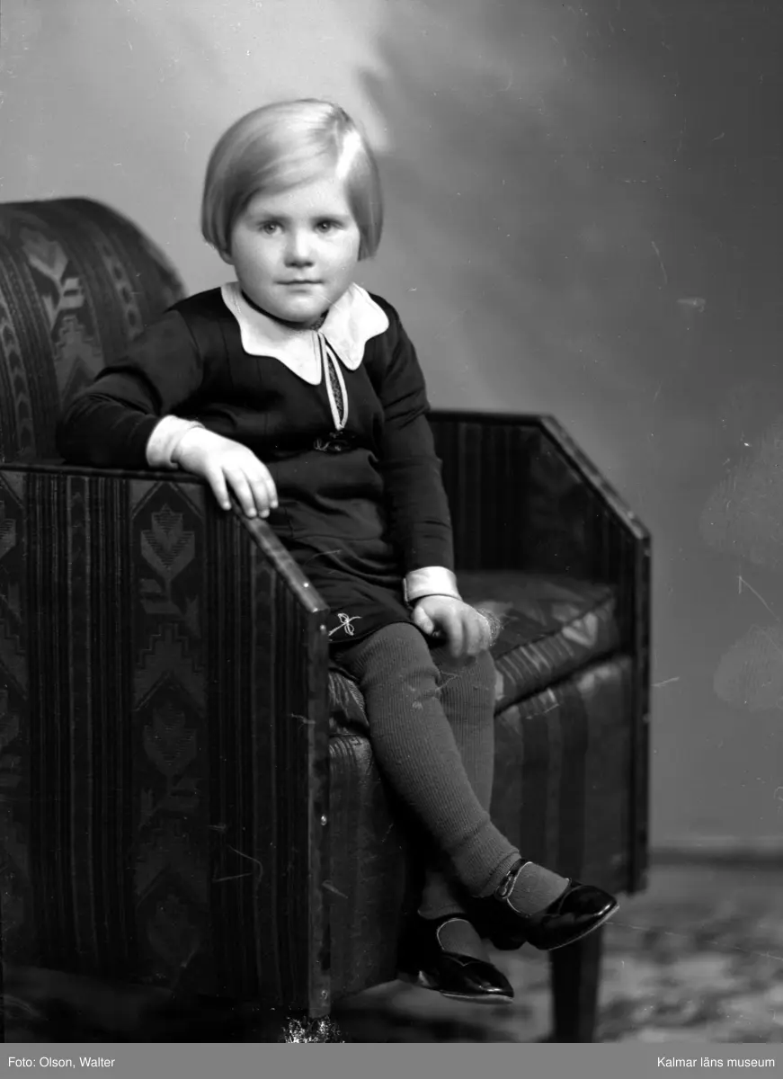 Ateljéfoto. Litet barn sittande i fåtölj.