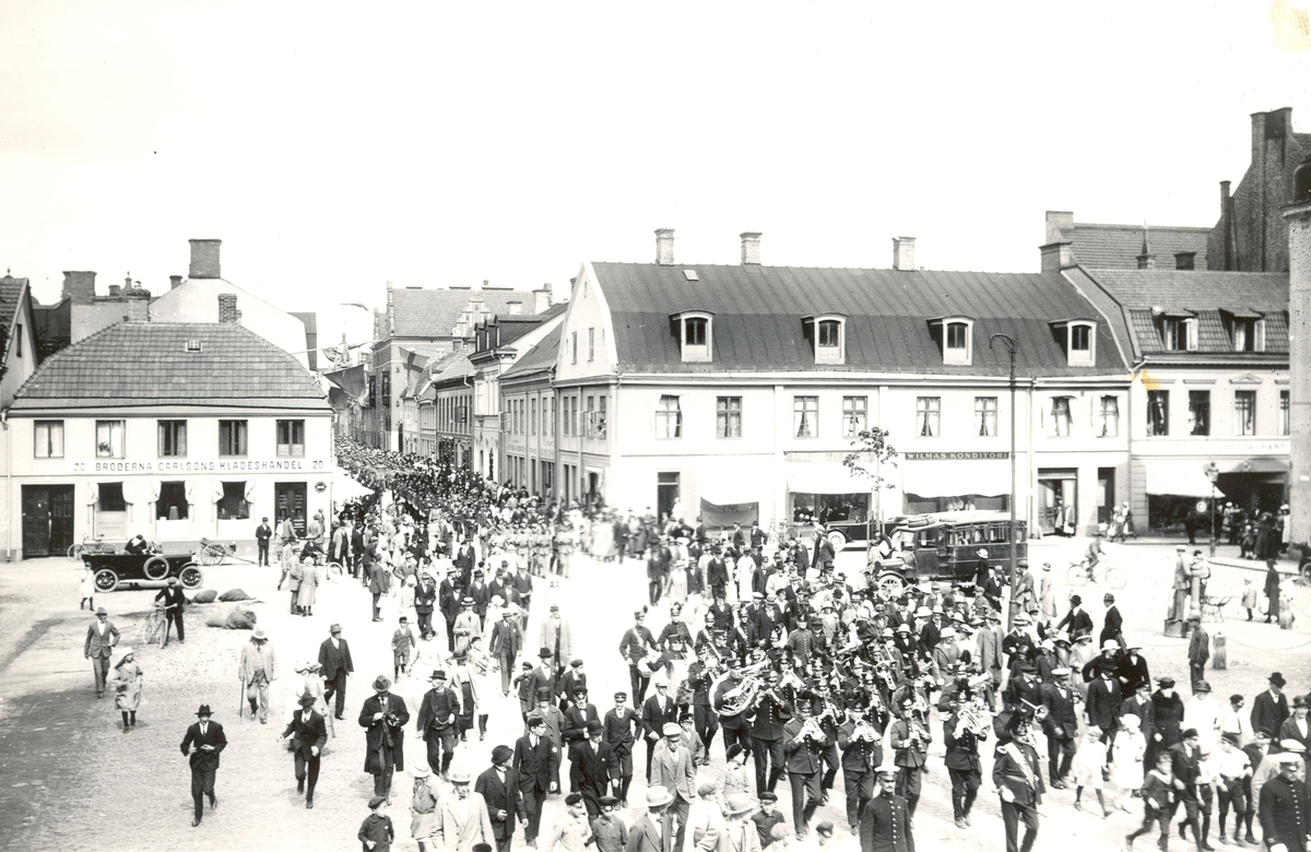 Kalmar Regementes 300-årsjubileum i Kalmar den 23 juni 1923. Marschen genom staden till Stadsparken, där en minessten avtäcktes.