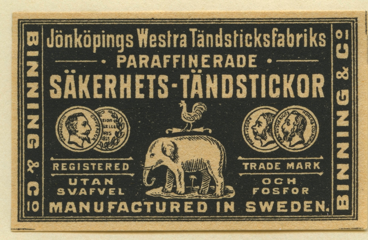Tändsticksetikett från Jönköpings tändsticksfabrik, "Jönköpings Westra Tändsticksfabriks paraffinerade säkerhets-tändstickor, Binning & Co".