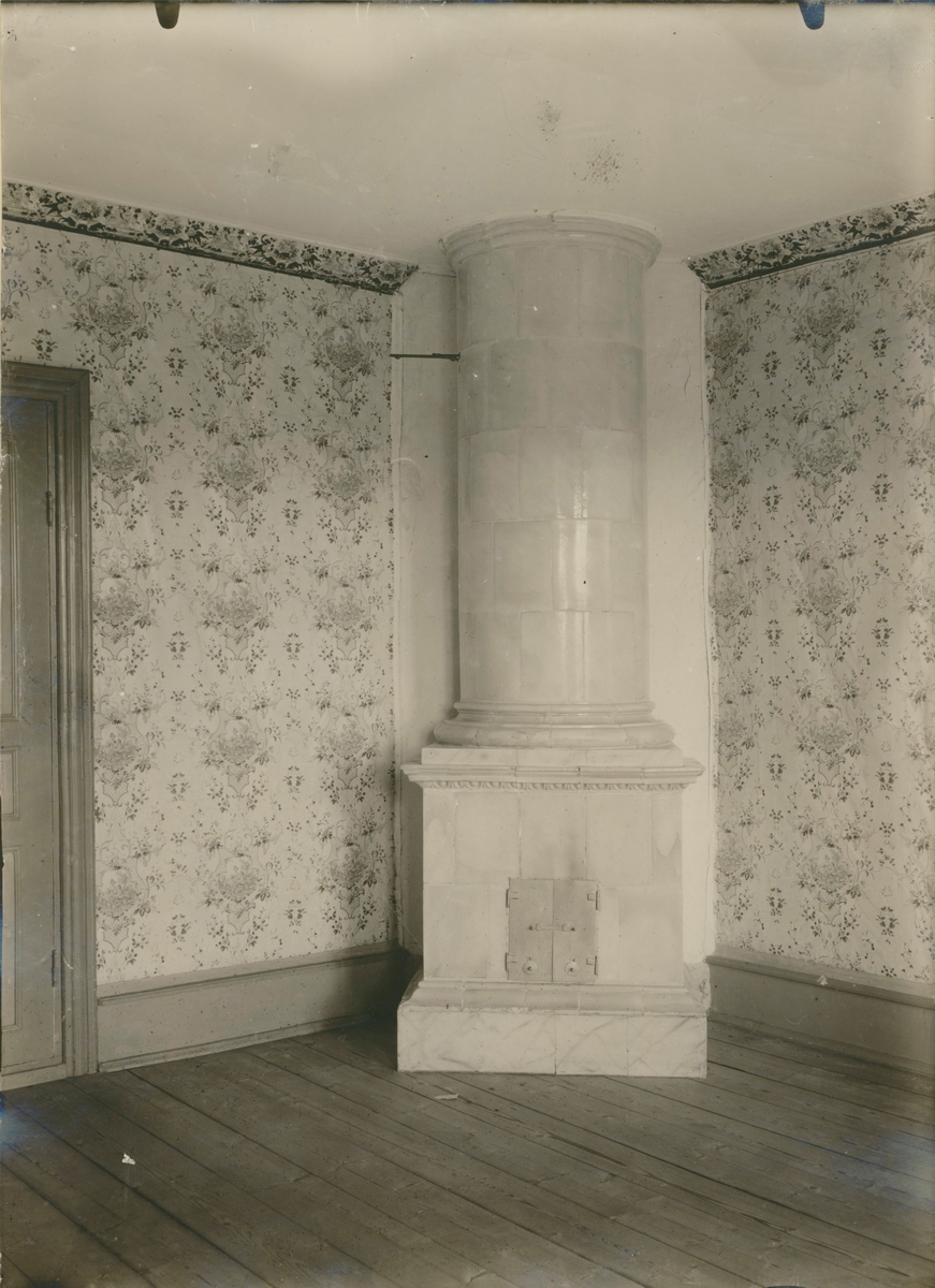 Huvudbyggningen, nedre bottnen, ett rum till vänster om förstugan. Kolonnkakelugn. Tryckta tapeter från 1800-talets mitt.