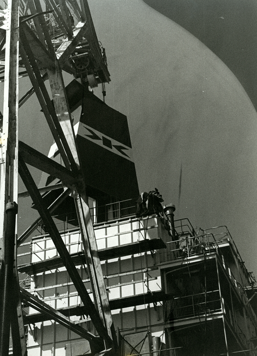 Skorsten som ska monteras på fartyg med hjälp av en lyftkran.