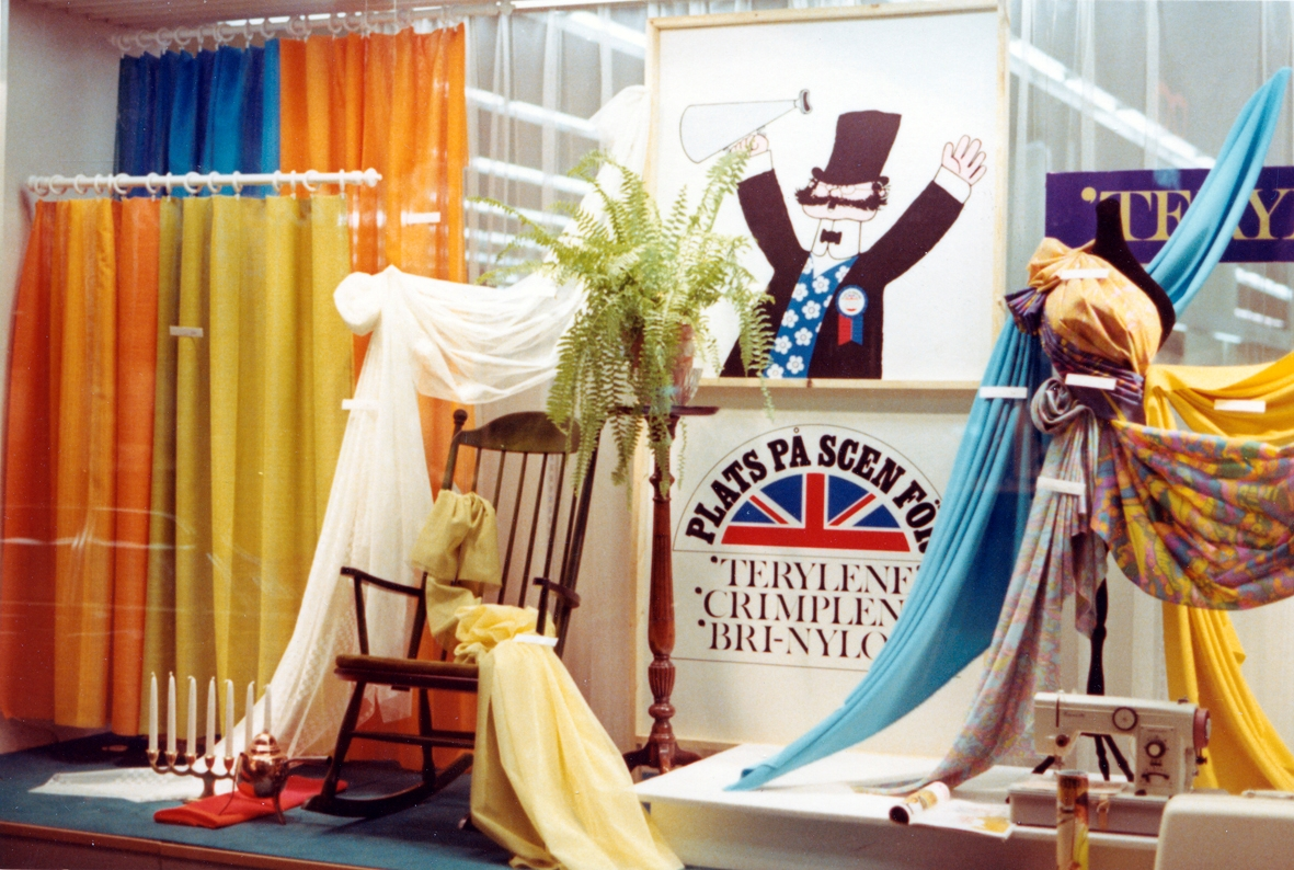 Skyltning med terylentyger i Domus skyltfönster, i Kalmar, 1968.