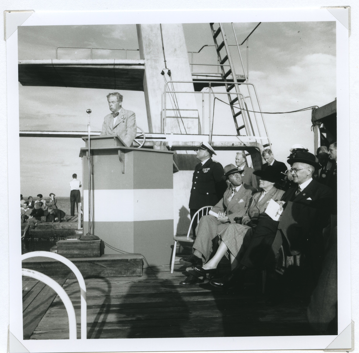 I talarstolen: Bankdir. Bertil Österberg. T.h. om talarstolen, fr. v.: Räddningschef Florin, Prins Gustaf Adolf, Ester Liden, Landshövding Arvid Liden.