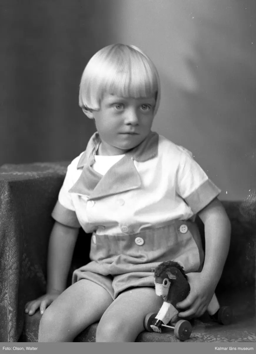 Ateljéfoto. Liten pojke med leksakshäst.
