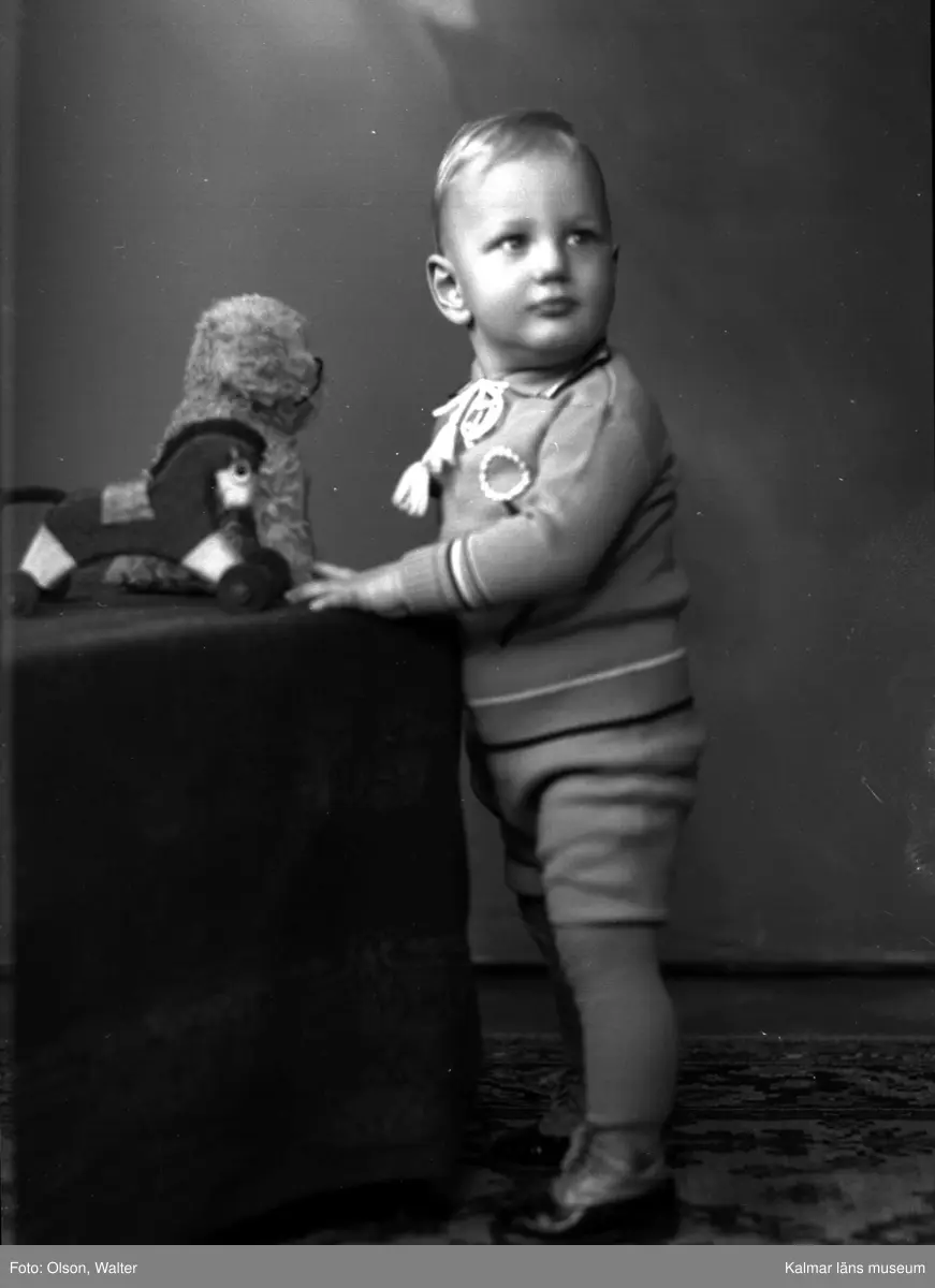 Ateljéfoto. Liten pojke med leksaker.