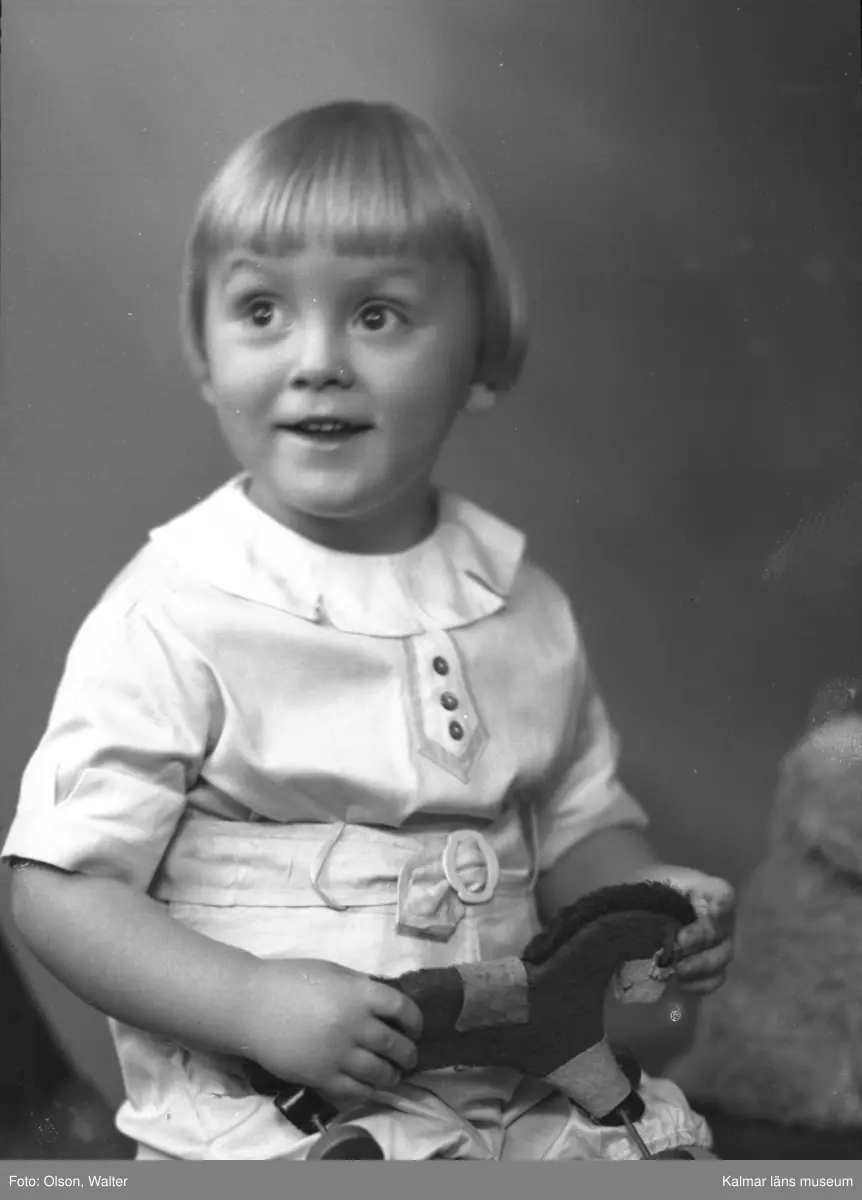 Ateljéfoto. Litet barn med leksakshäst.