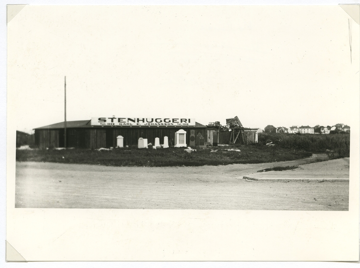Stenhuggeri, Karl E. Johansson. Gravstenar framför byggnaden.