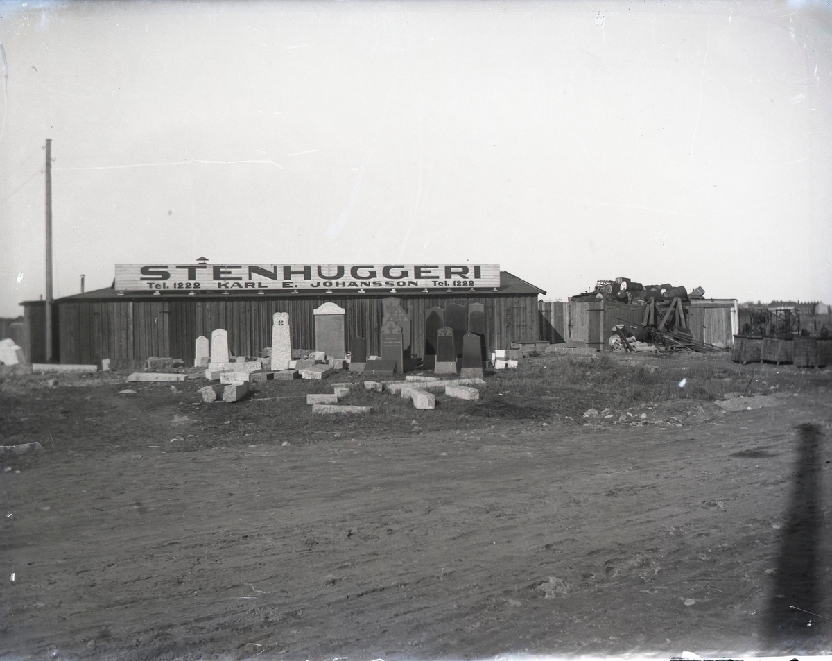 Stenhuggeri, Karl E. Johansson. Gravstenar framför byggnaden.