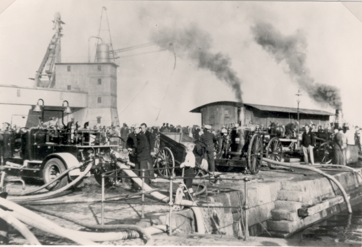 Ångkvarnsbranden i juli 1935. Vatten till brandbekämpningen pumpades upp ur hamnbassängen.