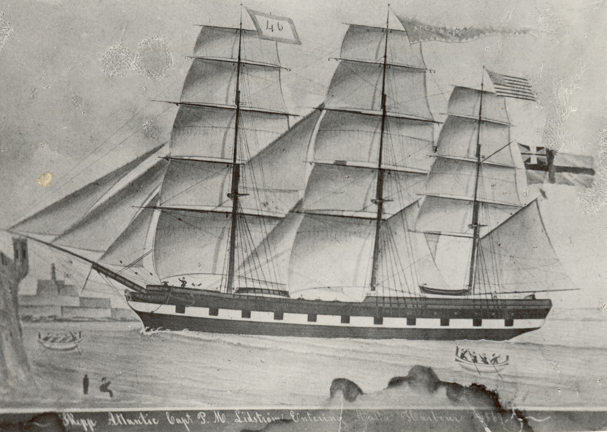 Titel: Atlantic Fullriggare, byggd 1848 i Williamsburg, tillhörde 1877 kapten N.J. Nyberg, Bollsta (Hörnösand). "Entering Malta harbour 1869". - Efter originalfoto, tillhörigt länsassessor J. Lidblom, Kalmar (1948).