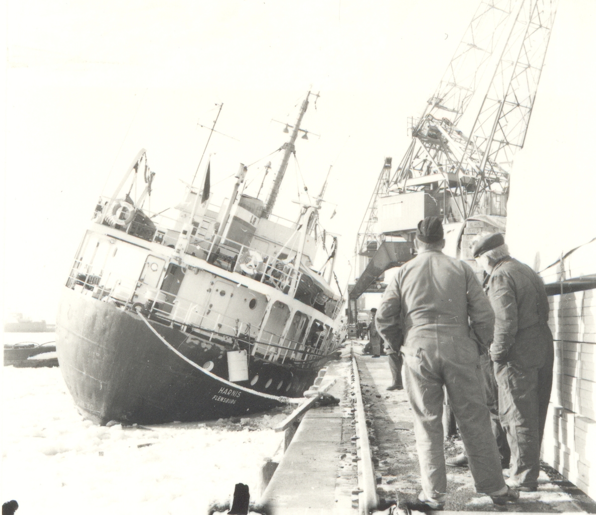 Fraktfartyget Harnis från Flensburg med kraftig slagsida vid kaj.