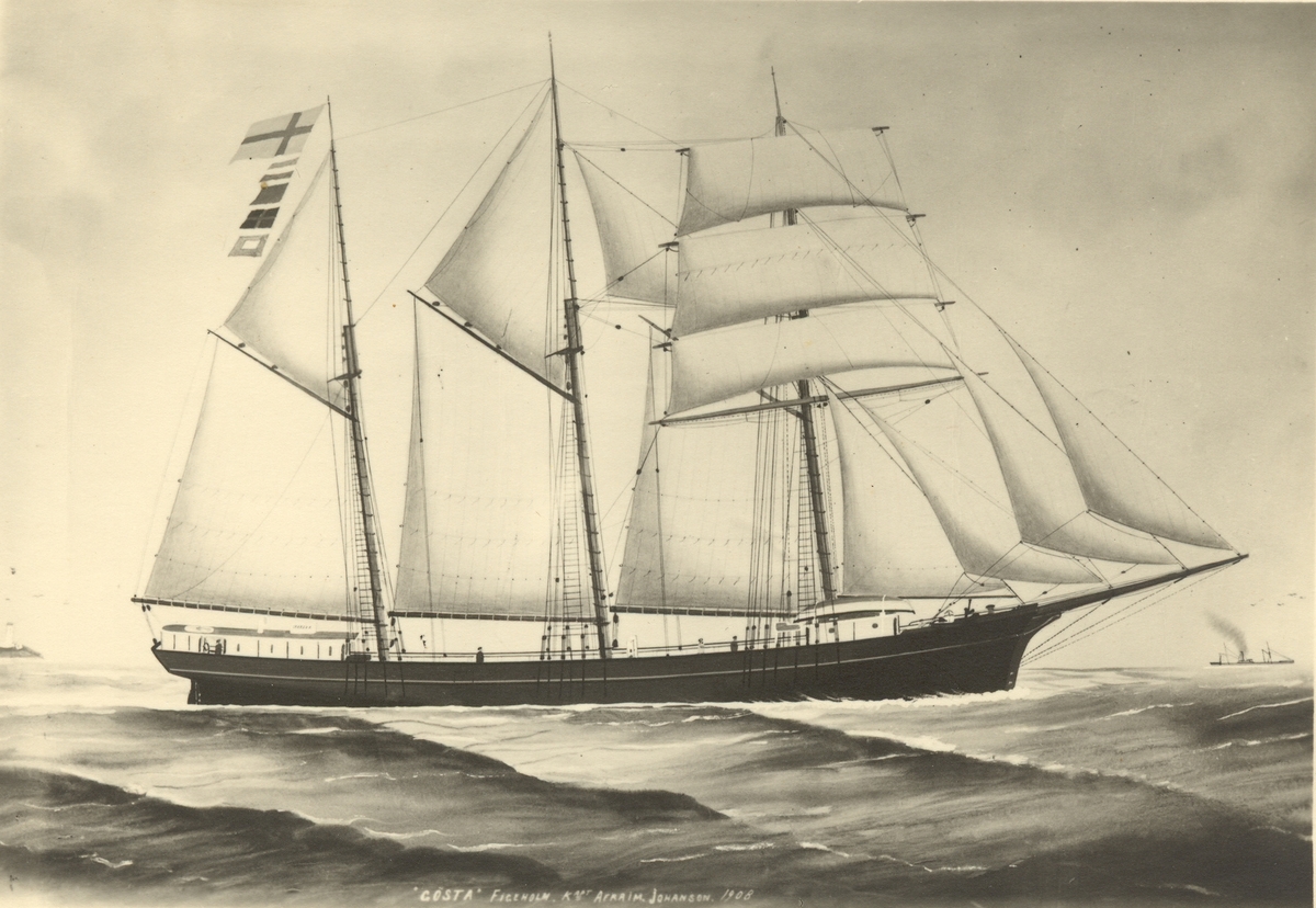 Tremastad skonare från Figeholm, byggd där. Målning 1908. Foto H.Sage, Figeholm.
