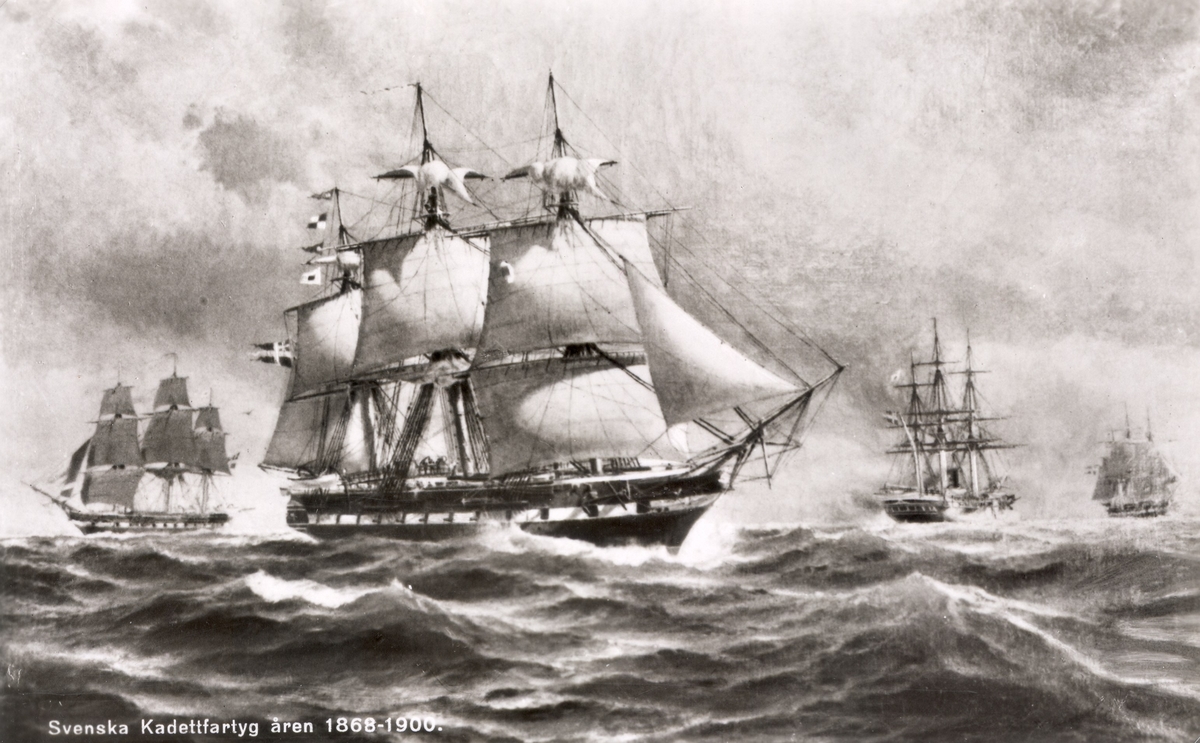 Fr. v. korvetten Norrköping (sjösatt 1858, 1400 ton), ångfregatten Vanadis (sjösatt 1862, 2200 ton), ångkorvetten Saga (sjösatt 1877, 1750 ton) och korvetten af Chapmann (sjösatt 1830, 1100 ton). Efter oljemålning av Jacob Hägg.