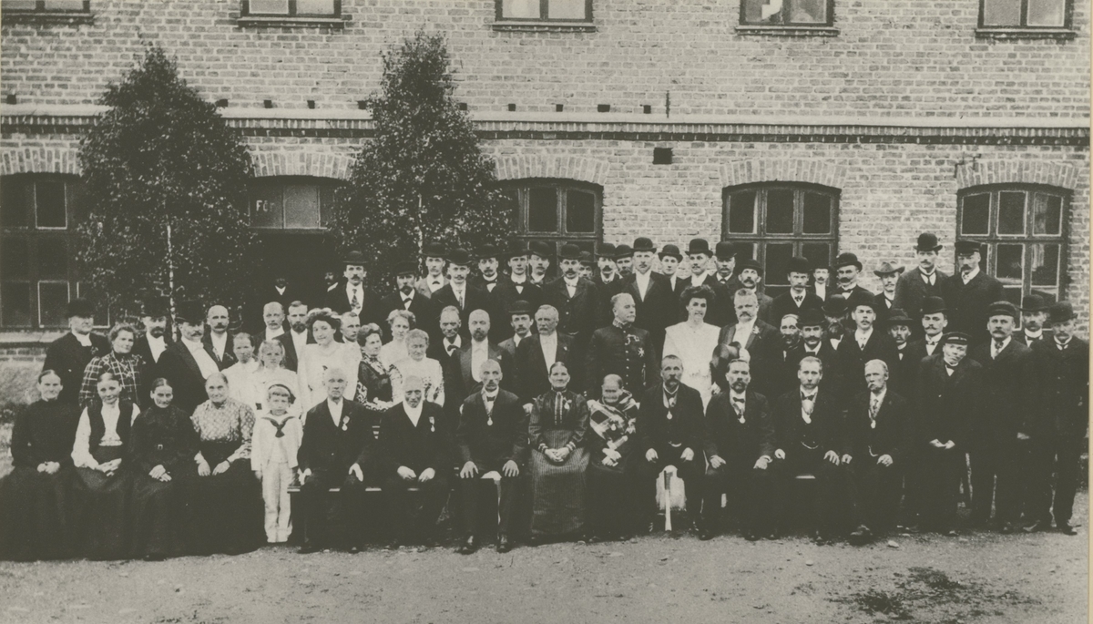 Gruppbild utanför stora sliperiet vid Orrefors glasbruk år 1909 med de nio medaljörerna, bolagsstyrelsen med flera.