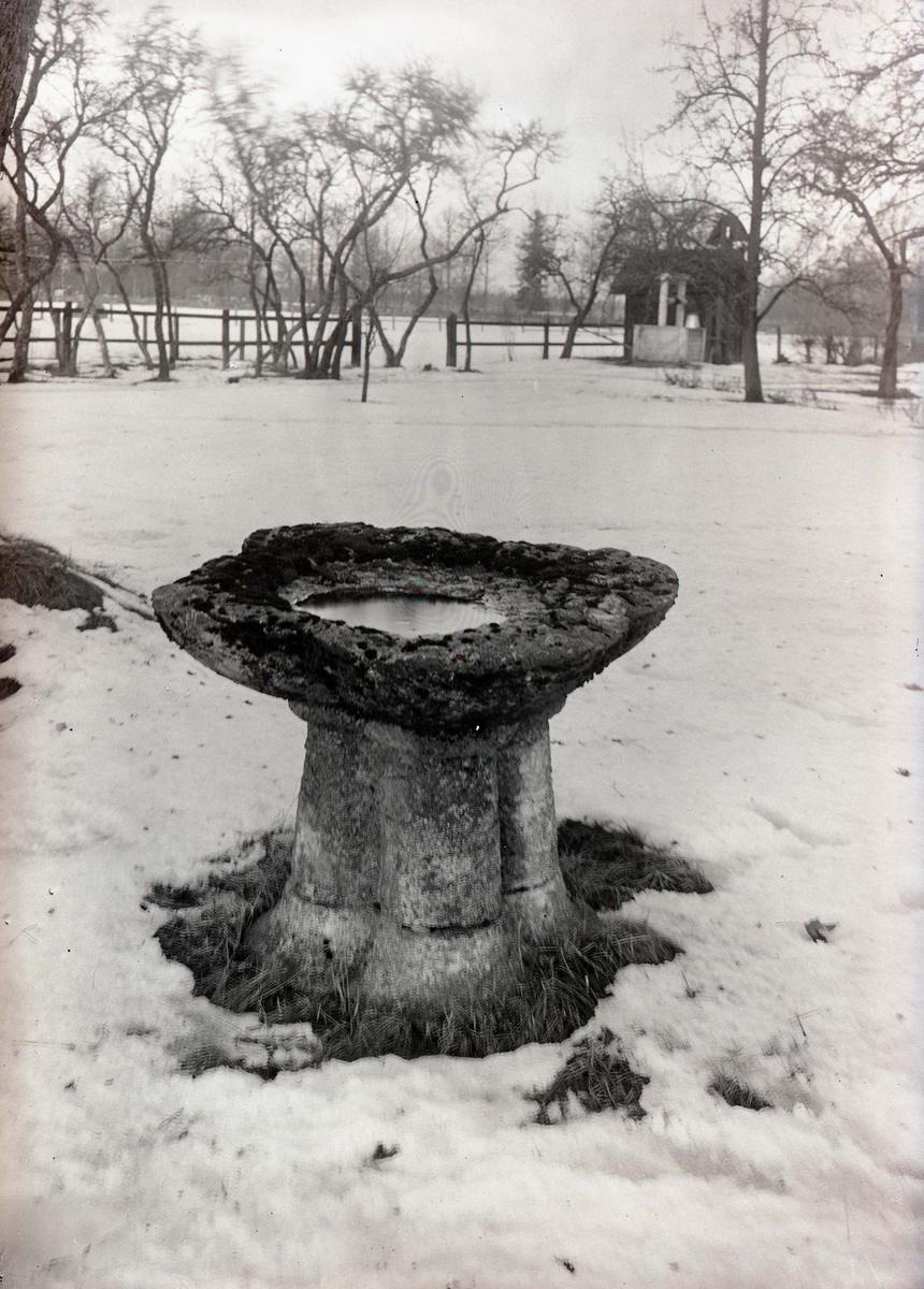 Kyrkans medeltida dopfunt i prästgårdens trädgård. Sedemera restaurerad och placerad i kyrkan.