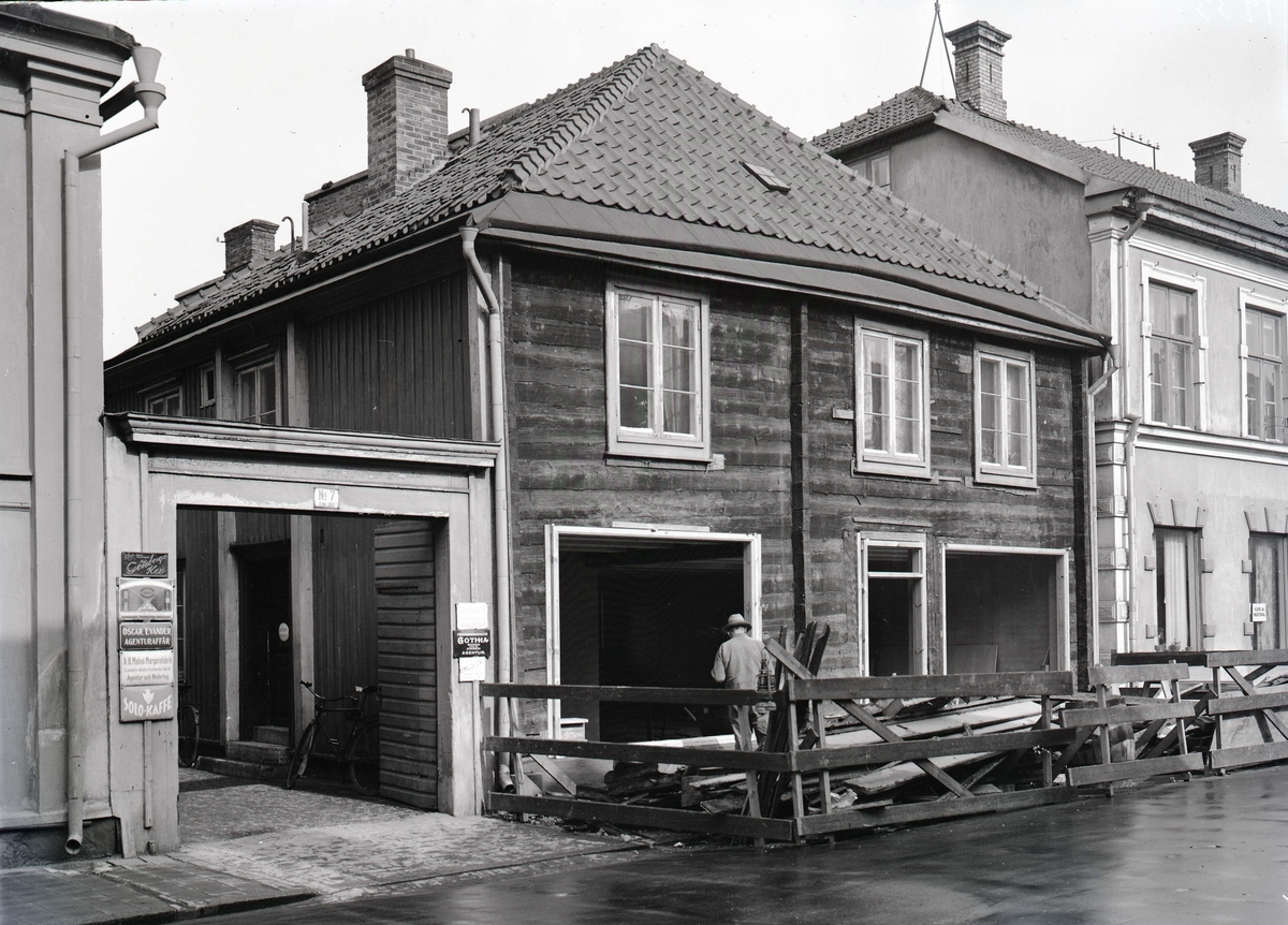 Knuttimrad byggnad i kvarteret Kopparslagaren inför rivning i början av 1970-talet.