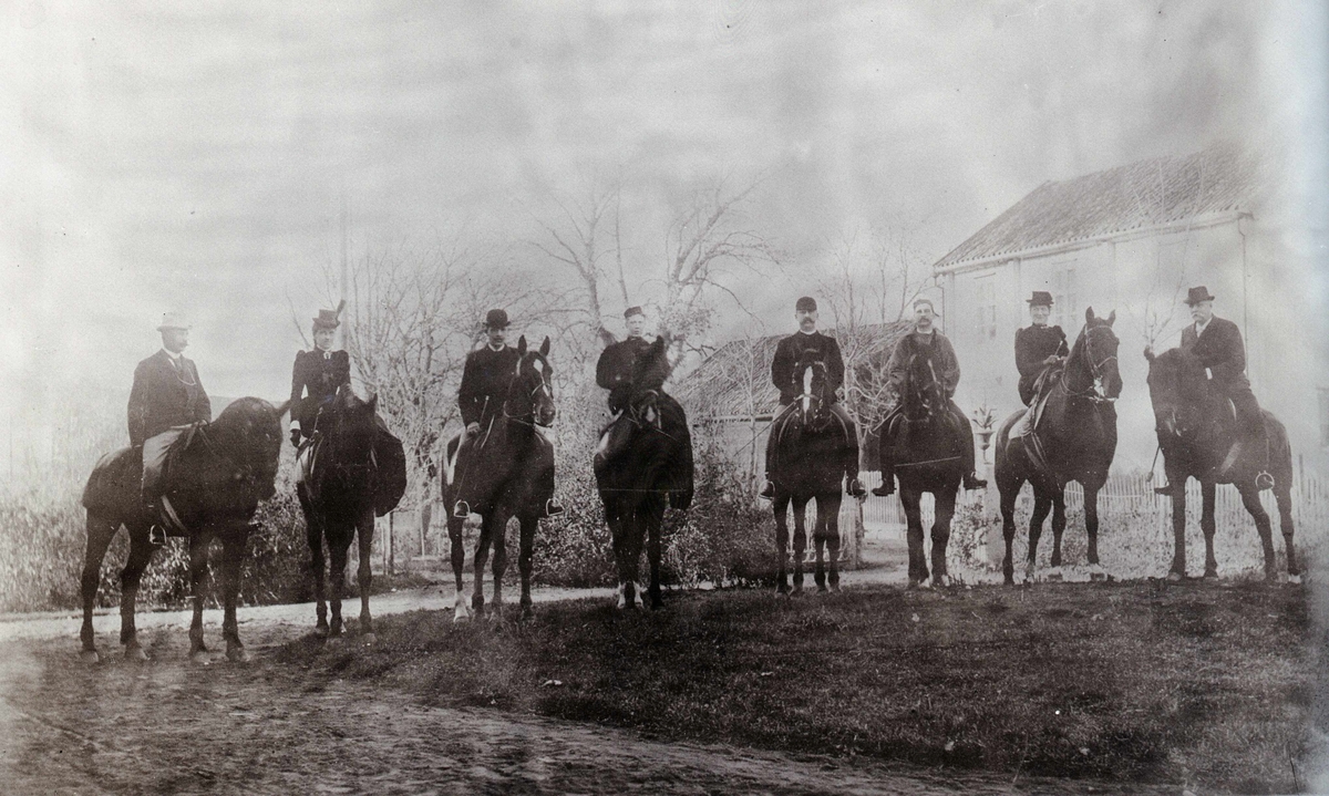 Ryttare uppställda, möjligen inför en jaktritt. Observera damerna i damsadel!