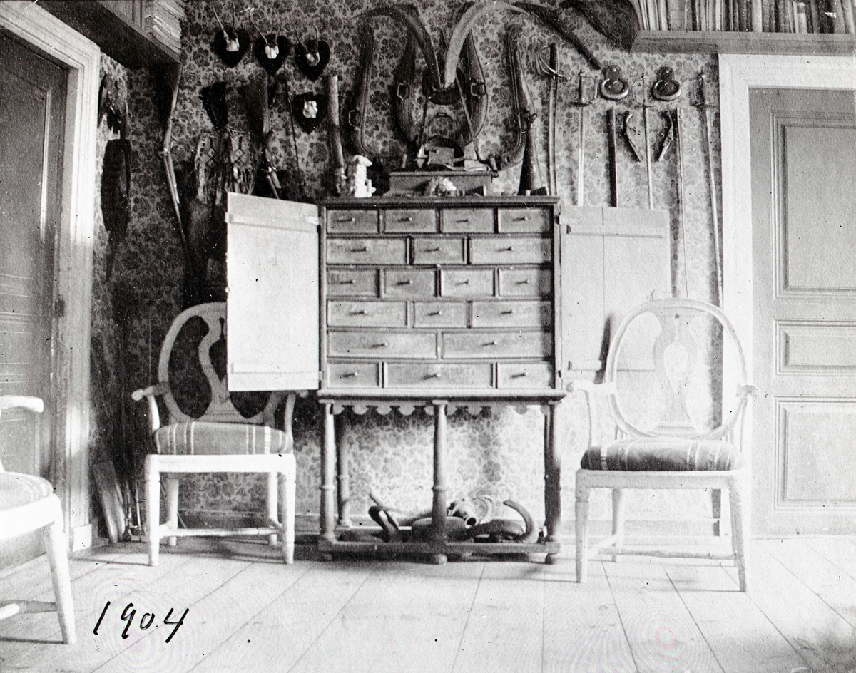 Interiör av hall med kabinettskåp medmera.
