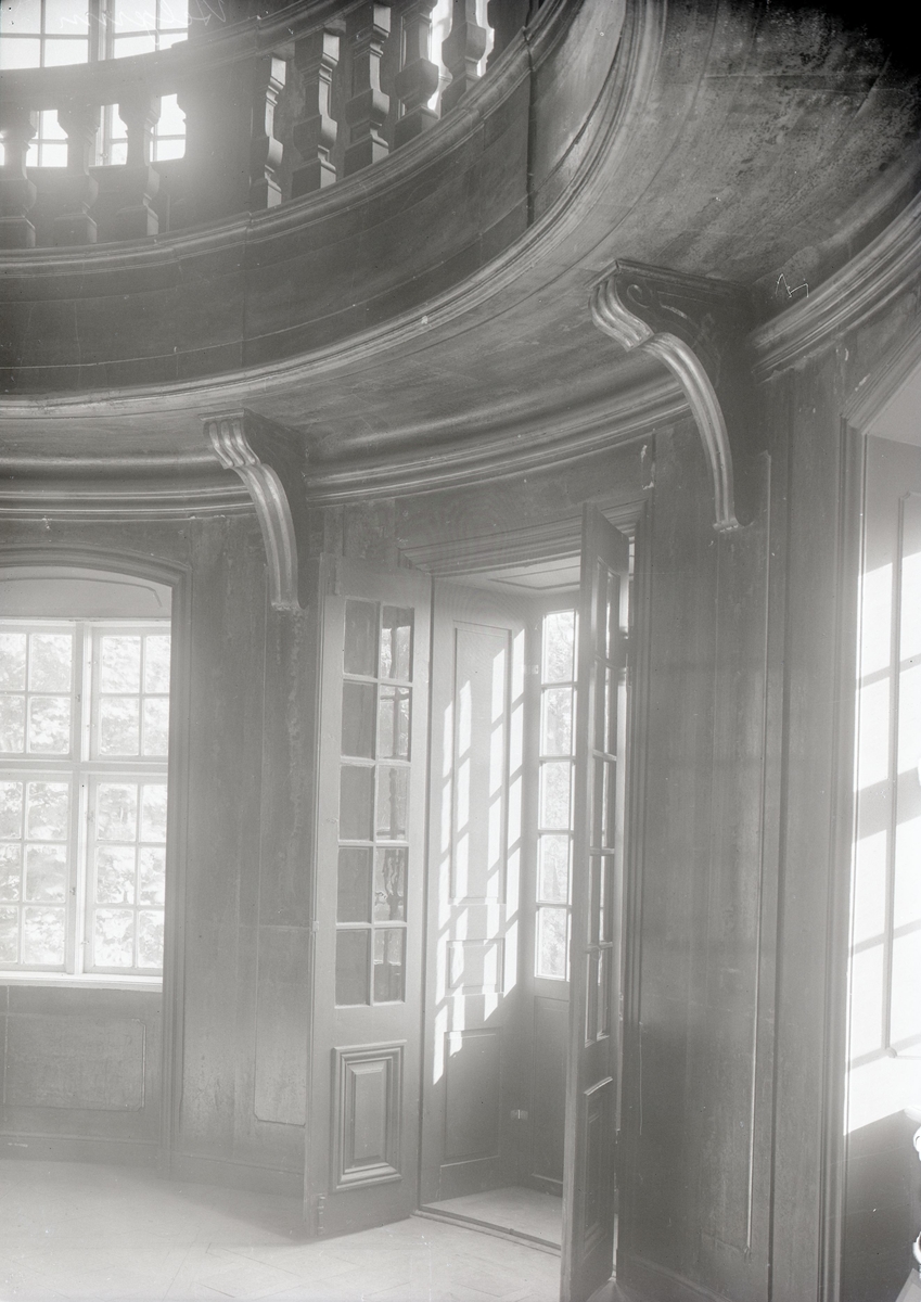 Interiör av musiksalongen på Helgerum med galleri ovanför.