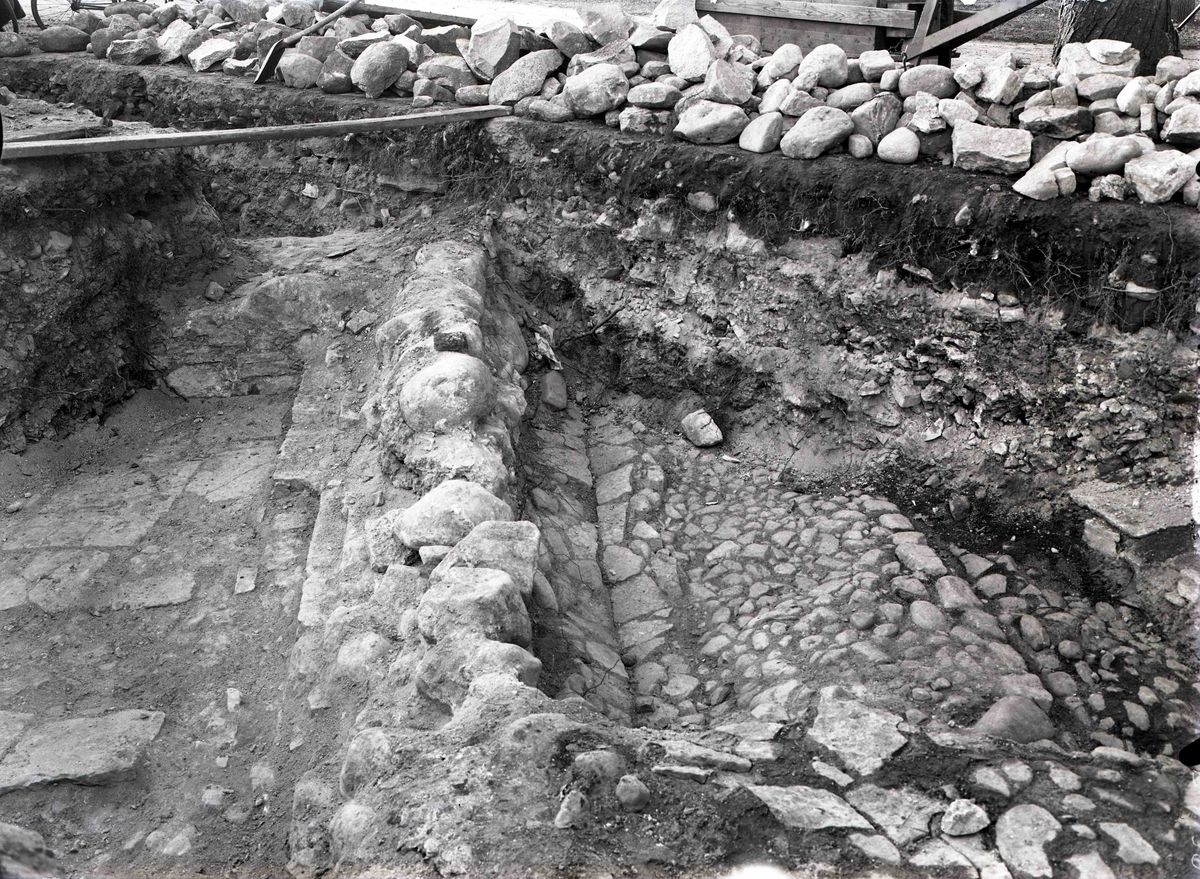 Grävningar på platsen för den nya restaurangen. Husgrund och kullerstensgata i den västra delen av området.