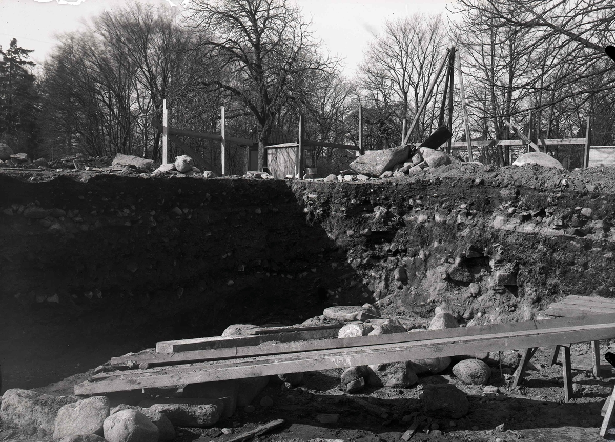 Lagersnitt i det hörn av utgrävningsområdet, där sektion R-S är tagen. Grävning på platsen för nya restaurangbyggnaden i Stadsparken.