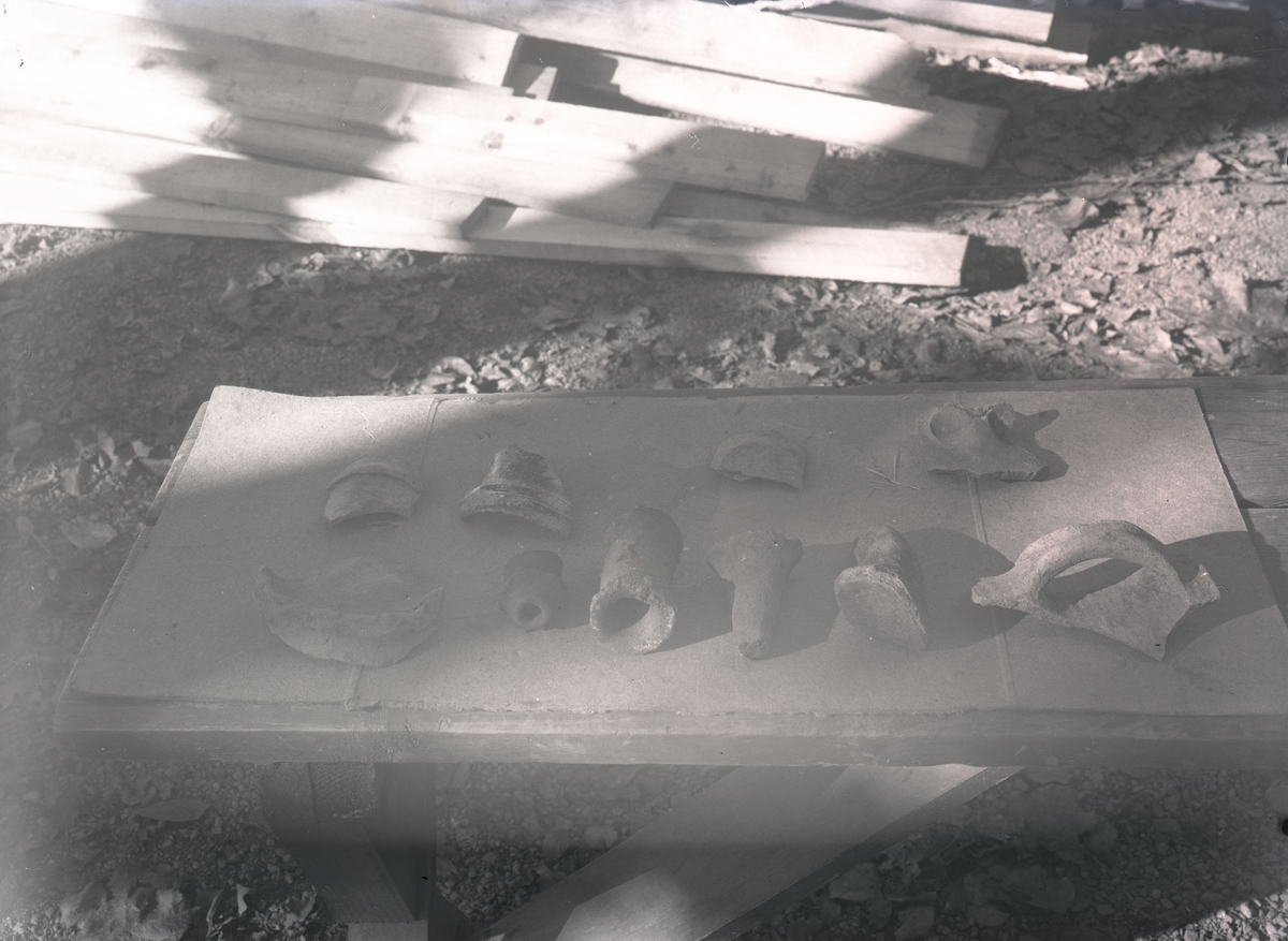 Från utgrävning å hotelltomten ca 1925. Fragment av medeltida keramik.