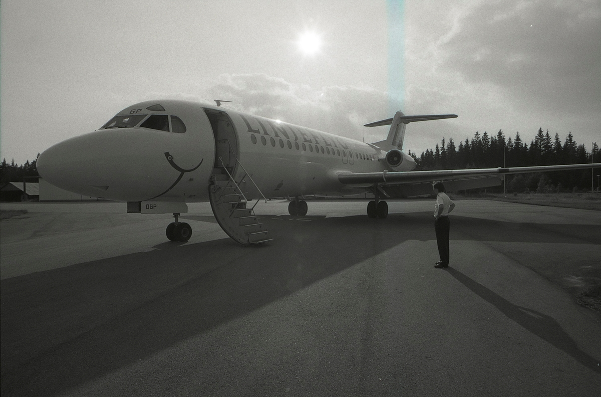 Titel: Fokker F28 på Skuteryds ( Emmaboda ) flygplats istället för i Ronneby, landar i Kalmar för att tanka på väg till Arlanda.
