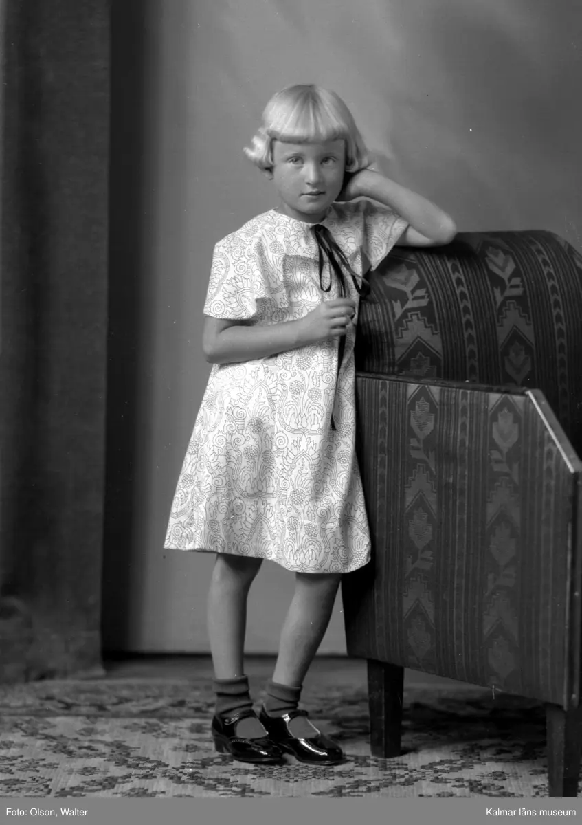 Ateljéfoto. Liten flicka stående vid fåtölj.