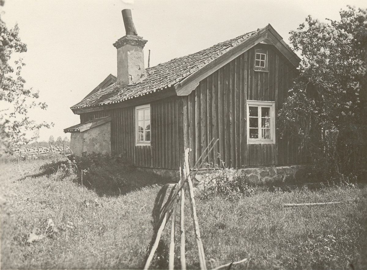 En öde lägenhet. Ryggåsstuga av timmer, rödfärgad. Utskjutande ugnsmur.
