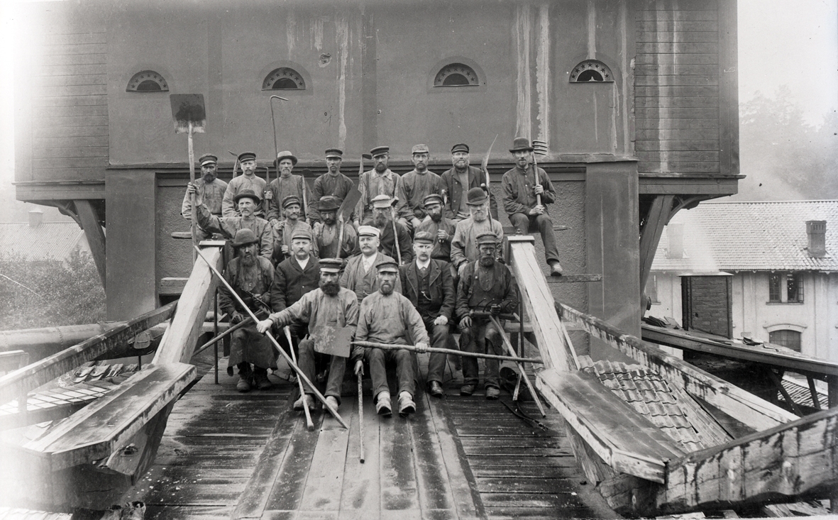 Gruppbild, arbetare med redskap.