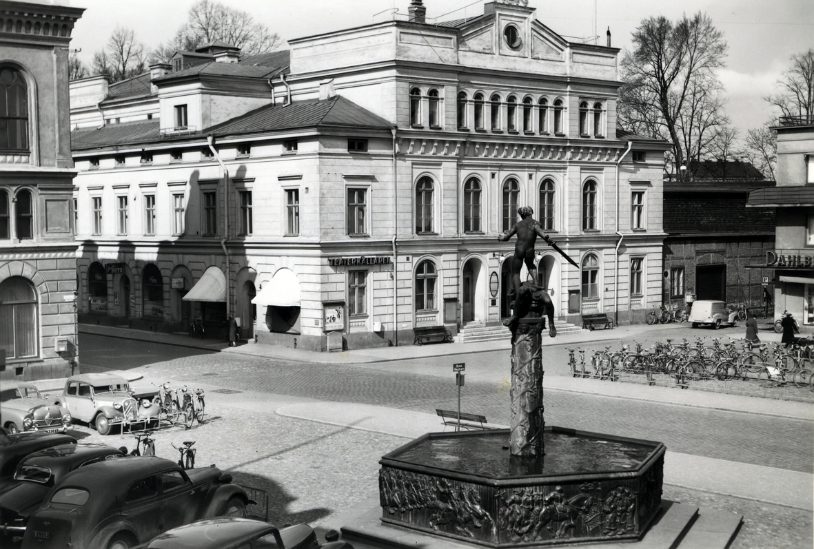 Vasabrunnen och Teatern, korsningen Västra Vallgatan och Storgatan.
