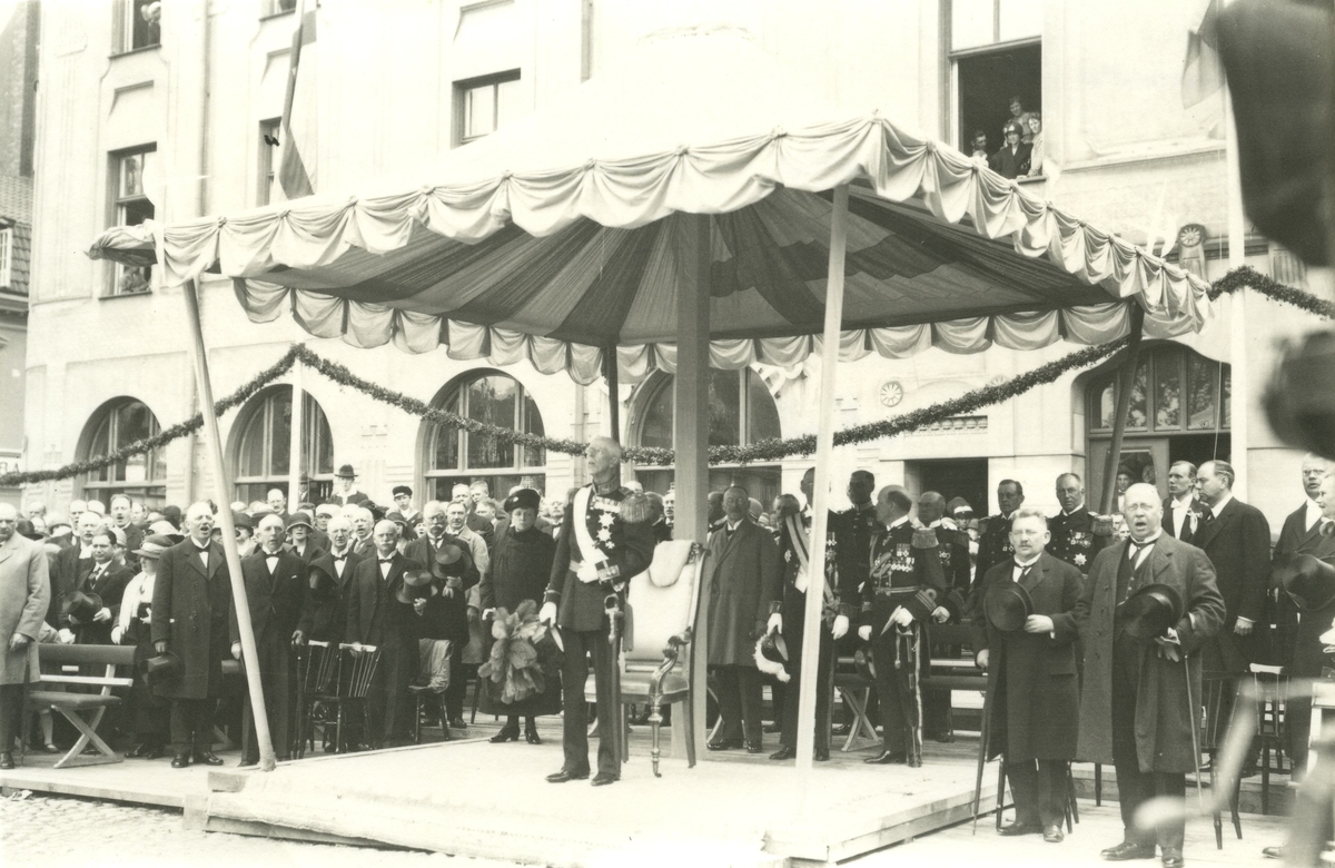 Gustav V håller invigningstalet på Larmtorget 1926.