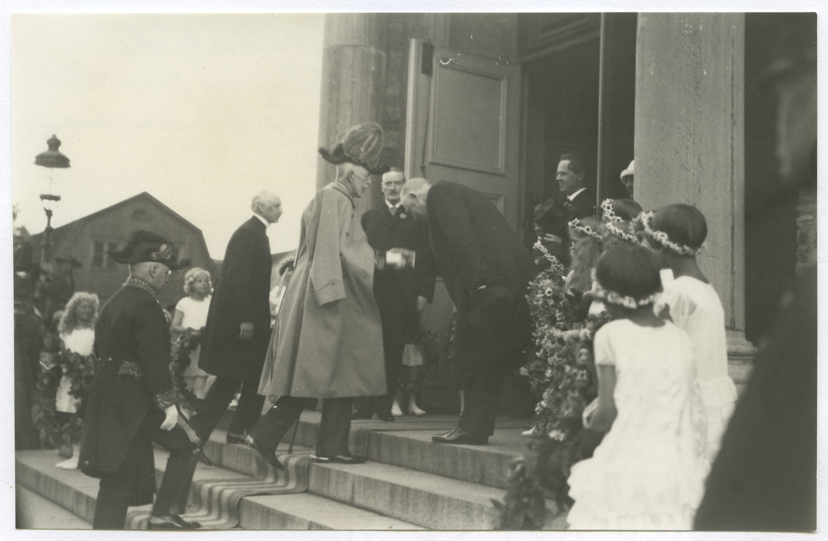 Gustav V på väg in i Kalmar domkyrka ingång från V. Sjögatan med prosten Erland Björk och landshövding John Falck.