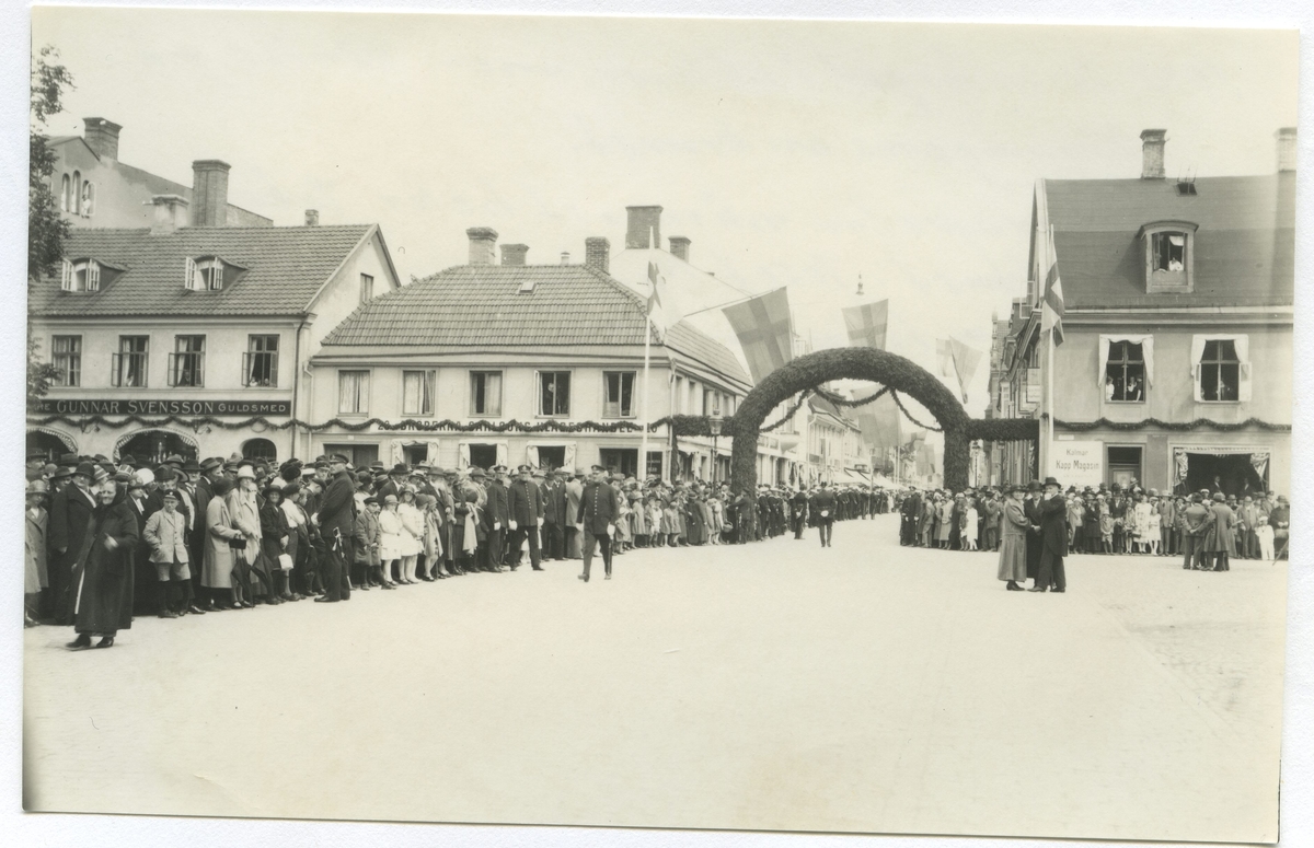 Larmtorget i Kalmar. Man väntar på Konungens ankomst. Poliser: Konstaplen närmast heter Johansson. Överkonstapel Josef Carlsson på marsh mellan honom och en annan konstapel står konstapel Löfstrand.