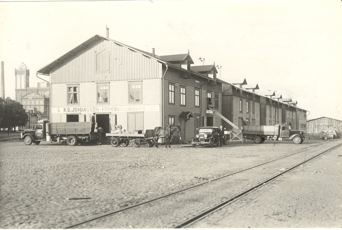 Nuvarande skeppsbrokiosken. Grosshandlare K G Johansson vid personbilen 1940-41. Obs! gengasaggregat på lastbilarna.