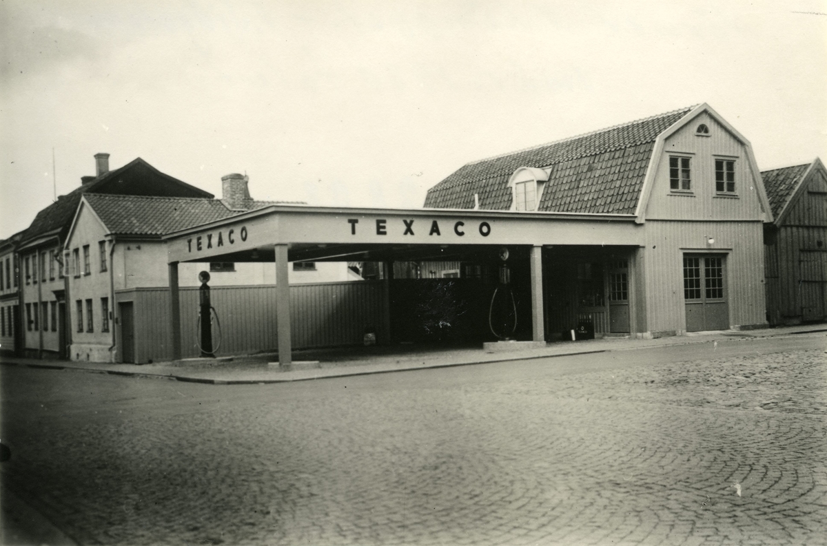 Bensinstation i hörnet av N:a Långgatan - Västra Sjögatan omkring 1930.