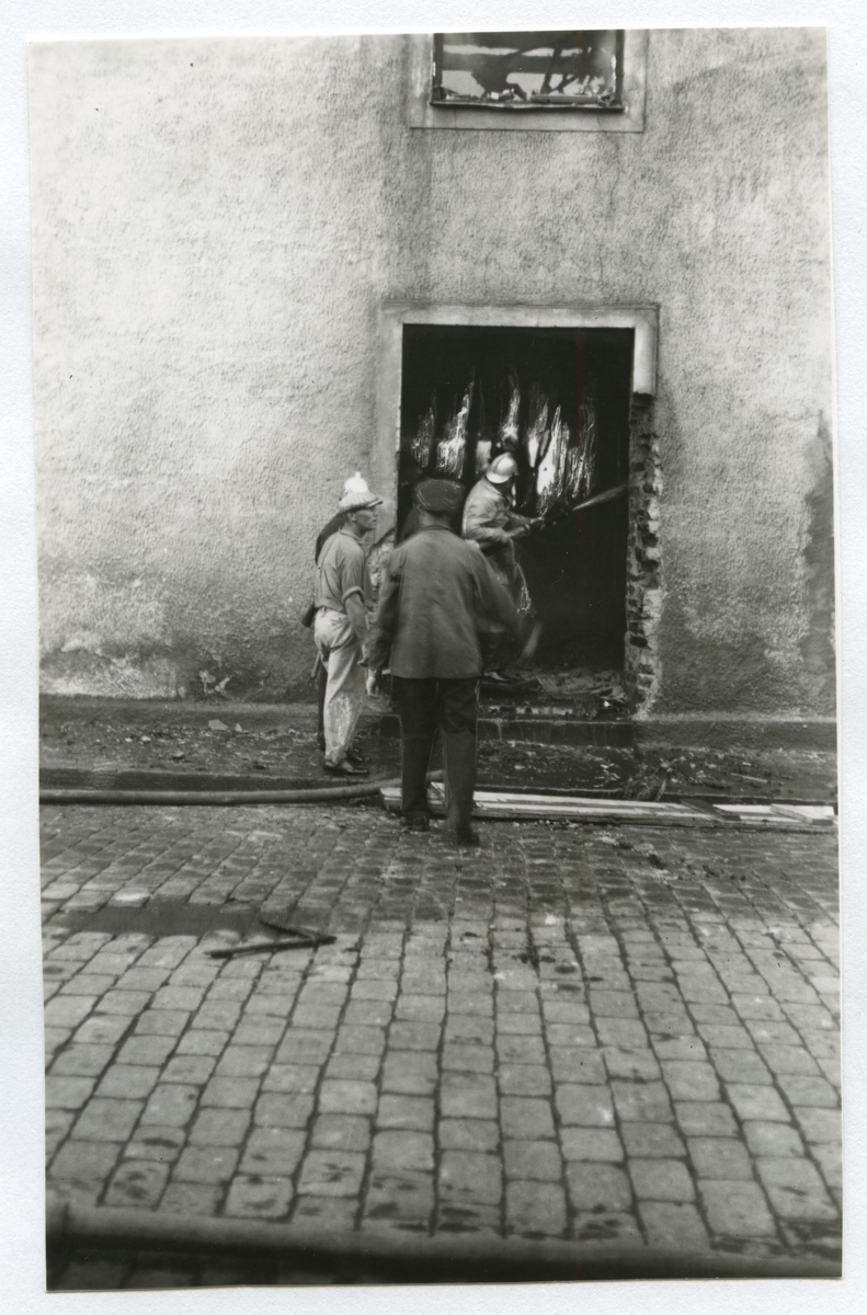 Ångkvarnsbranden i Kalmar 6 juli 1935. Brandbekämpning in i ett trapphus.