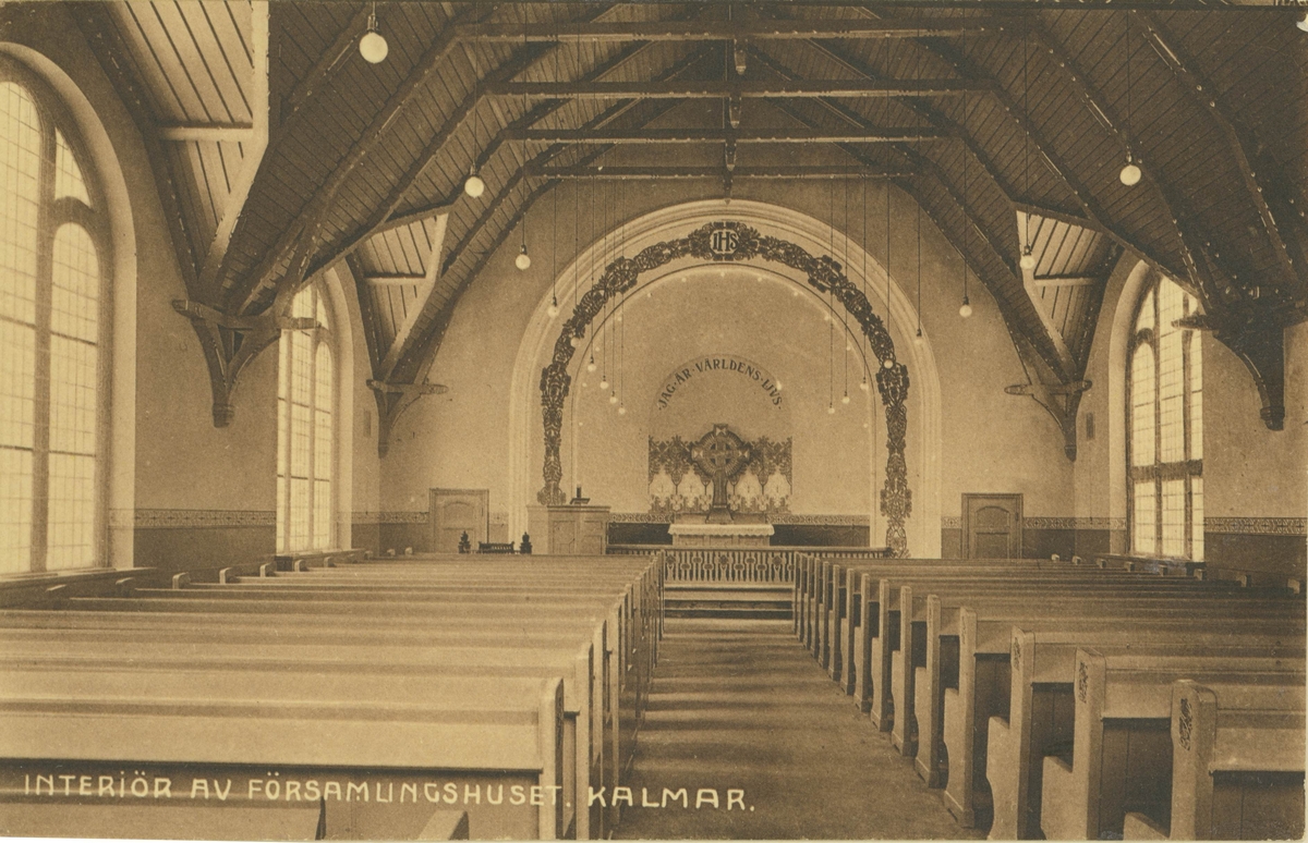 Vykort föreställande församlingshuset i Kalmar, interiört. Ritat år 1907 av stadsarkitekt J Fred Olson, och invigt 1909.