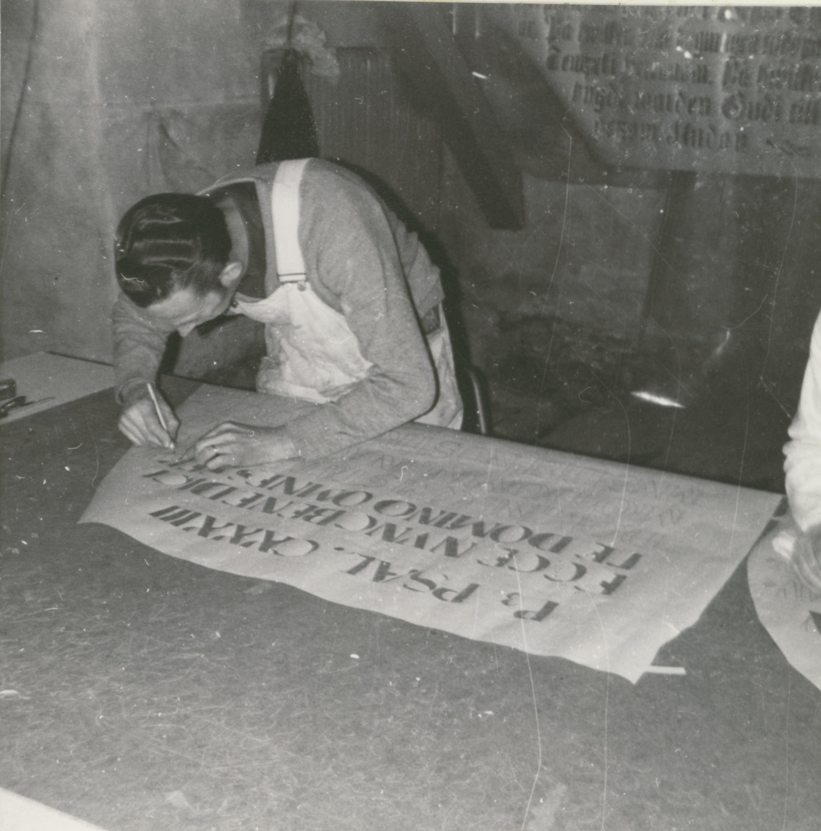 Slottskyrkans renovering Utskärning av mall till dekoration.