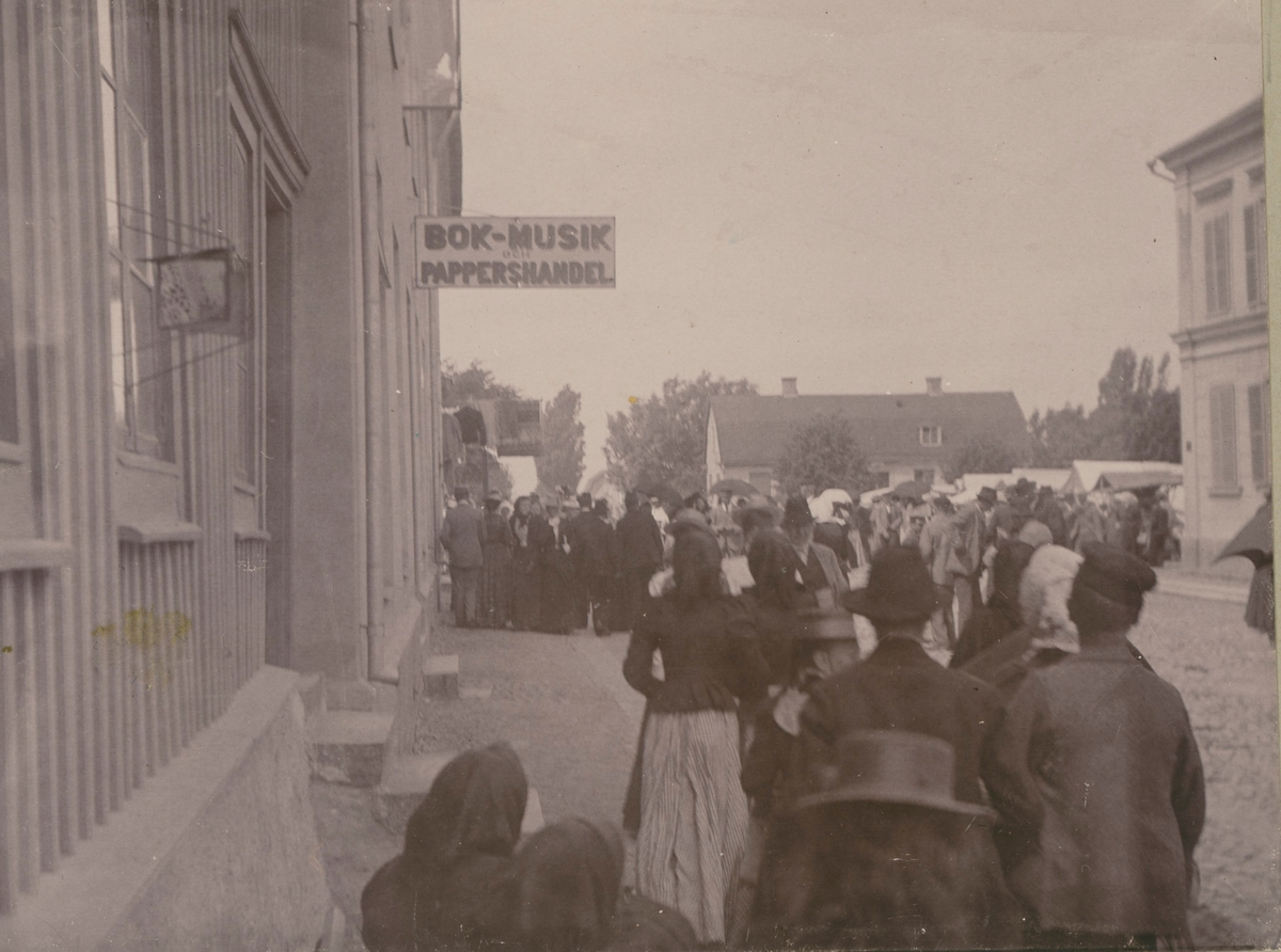 Folkmassa på Storgatan mot torget. Till höger syns Adlersparreska huset, i Borgholm. Möjligen marknadsdag.