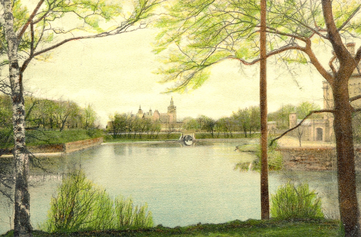 Kolorerat vykort föreställande Systraströmmen i Kalmar, med ravelinen och fängelset till höger och slottet rakt fram.