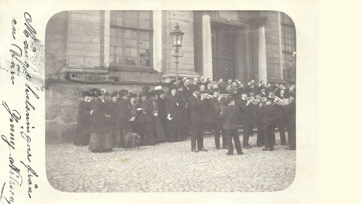 Vykort föreställande en kör, och blåsorkester, utanför Domkyrkan i Kalmar.