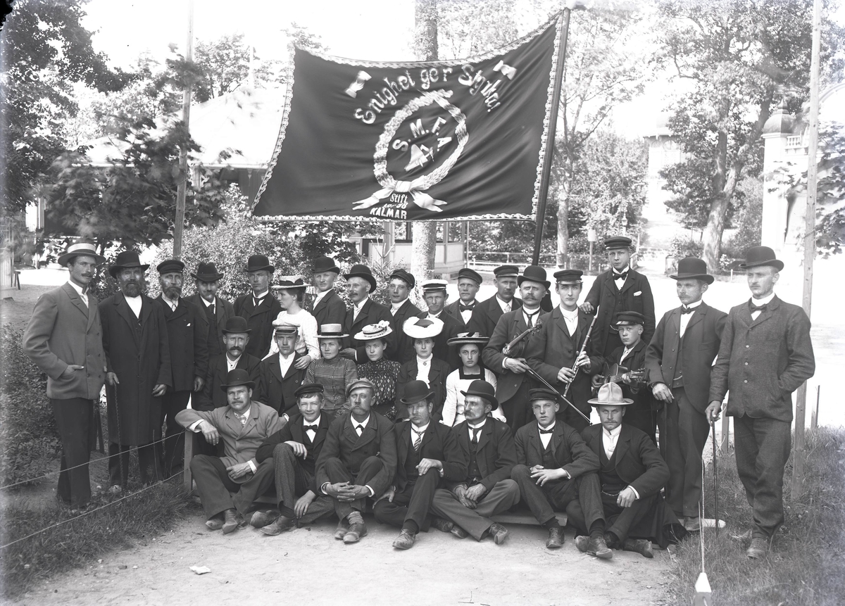 Sammankomst för murare i Folkets park, under fackföreningsfanan.